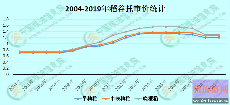 2月末國家發(fā)展改革委、財政部、農(nóng)業(yè)農(nóng)村部、糧食和儲備局、中國農(nóng)業(yè)發(fā)展銀行五部門聯(lián)合公布了2019年稻谷最低保護價。經(jīng)國務(wù)院批準,2019年生產(chǎn)的早秈稻(三等,下同)、中晚秈稻和粳稻最低收購價格分別為每50公斤120元、126元和130元,保持2018年水平不變(如下圖所示),這對于農(nóng)戶來講無疑是一個好消息,畢竟在稻谷品種在前兩年連續(xù)兩次下調(diào)保護價,農(nóng)戶整體種植收益受到一定影響。雖然表面上有政策托底,收益有一定的保障。但面臨疲軟的大米市場,高庫存壓力,在無極端天氣及自然災(zāi)害的情況下,今年新稻上市后稻價或?qū)⒌烷_。主要是即使新稻上市后,陳稻還將在市場流通一段時間,勢必會影響新稻價格的走高?v觀近兩年稻谷托市,啟動的時間均較晚,國家主張市場化收購,市場缺乏支撐。同時若地方儲備價格高于托市價,那么托市暫不啟動,江蘇省在2018年并未稻谷啟動托市,這即是一個很好的例子,部分貿(mào)易商囤糧出現(xiàn)了虧損,因此以上事實證明,稻價低米價自然不會漲價。