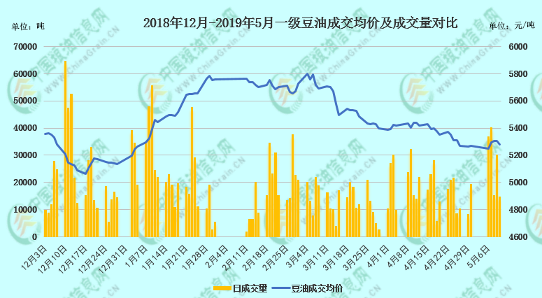 因5月6日美方計(jì)劃在5月10日對(duì)中國(guó)輸美的2000億美元商品加征關(guān)稅,國(guó)內(nèi)外市場(chǎng)格外關(guān)注,市場(chǎng)炒作貿(mào)易戰(zhàn)升級(jí)的憂慮令近期國(guó)內(nèi)豆類(lèi)油脂期貨走強(qiáng),如圖所示,5月10日當(dāng)周?chē)?guó)內(nèi)主要地區(qū)油廠豆油成交較前期明顯回升。截至5月6日當(dāng)天,國(guó)內(nèi)沿海主要廠商一級(jí)豆油現(xiàn)貨平均價(jià)格約5277.5元/噸,當(dāng)日大連地區(qū)市場(chǎng)一級(jí)豆油主流報(bào)價(jià)在5260元/噸、天津地區(qū)5230元/噸、日照地區(qū)5290元/噸、廣州5250元/噸、北海5190元/噸左右。另外最近又有消息稱美方加稅實(shí)施時(shí)間延期,且美豆USDA報(bào)告及馬棕MPOB報(bào)告也已公布,當(dāng)前國(guó)內(nèi)油脂市場(chǎng)該如何看待?中國(guó)糧油信息網(wǎng)分析師辛顯明將對(duì)此進(jìn)行簡(jiǎn)要說(shuō)明。