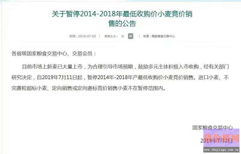 6月份小麥市場整體呈現(xiàn)高開低走的局面,主要原因在于最低收購價繼續(xù)下調(diào),加之新麥豐收產(chǎn)量比較好,供應(yīng)壓力增加,且今年新季小麥質(zhì)量很好,芽麥較去年大幅減少,需求方面比較單一,主要還是靠制粉企業(yè)消化。但面粉正處于消費性淡季,供需明顯不配套,使之小麥價格跌跌不休。進入7月份來自政策性利好消息不斷傳來,7月2日河南省將在符合條件的相關(guān)地區(qū)啟動2019年小麥最低收購價執(zhí)行預(yù)案。另國糧中心公布自2019年7月11日起,暫停2014年-2018年產(chǎn)最低收購價小麥競價銷售(如圖所示)。政策支撐小麥是否迎來上漲機會?還能漲多少?中國糧油信息網(wǎng)分析師張艷秋認為,小麥價格不會出現(xiàn)大幅度上漲,即使有政策托底,小麥價格也將圍繞保護價浮動,上漲幅度不會超過0.02元/斤。