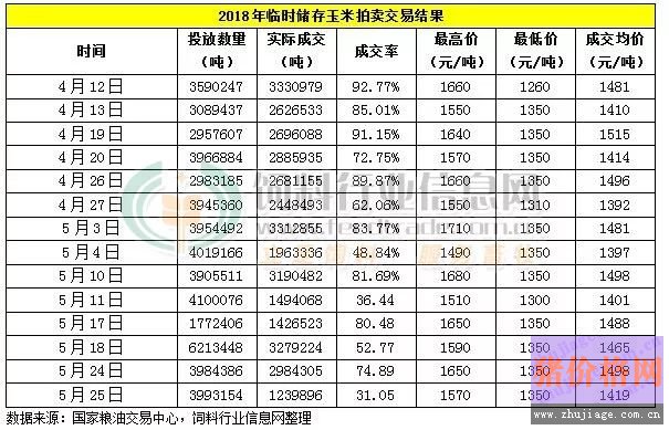 今年4月12日國(guó)家臨儲(chǔ)玉米拍賣(mài)銷(xiāo)售正式啟動(dòng),4月12日-4月27日期間周度投放總量在700萬(wàn)噸左右,而進(jìn)入5月之后,臨儲(chǔ)玉米拍賣(mài)周度投放數(shù)量增加至800萬(wàn)噸,截止本周二已經(jīng)進(jìn)行了七輪拍賣(mài),投放量近5278.49萬(wàn)噸,成交總量約為3586.88萬(wàn)噸,總成交率67.97%。雖然拍賣(mài)糧持續(xù)穩(wěn)定量投放,已成交的拍賣(mài)糧也陸續(xù)出庫(kù),拍賣(mài)成交熱度開(kāi)始下降、成交率也呈理性回落趨勢(shì),但是產(chǎn)地基層新糧陸續(xù)見(jiàn)底,基層還有少量17年優(yōu)質(zhì)玉米待價(jià)出售,優(yōu)質(zhì)玉米供應(yīng)偏緊仍支撐拍賣(mài)成交率,臨儲(chǔ)玉米拍賣(mài)成交情況整體良好且溢價(jià)水平小幅上漲,其中吉林以及遼寧玉米最高溢價(jià)超過(guò)100元/噸。具體交易情況見(jiàn)下表: