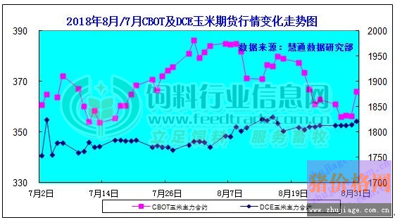 本月美國玉米期貨市場呈偏弱震蕩走勢,截止8月31日,9月合約價格比一月前下跌20.25美分/蒲式耳,報收352美分/蒲式耳;本月大連玉米期價階段性上行,截至8月31日大連玉米1809合約收于1904元/噸,較上月末上漲82元/噸。