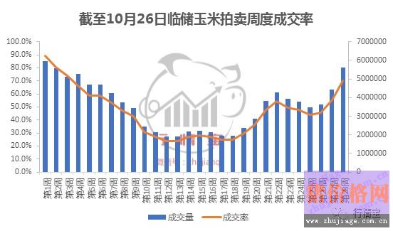 本年度臨儲玉米拍賣已于周五(10月26日)結(jié)束。根據(jù)行情寶追蹤數(shù)據(jù)顯示:截至10月26日,國家政策性玉米拍賣共進行28周,政策玉米(包括臨儲玉米、分貸分還及定向銷售)總投放量2.2億噸,累計成交量超過1億噸,成交率45.54%,遠(yuǎn)遠(yuǎn)超過2017年臨儲拍賣25周的總成交量5751萬噸。自26周開始臨儲拍賣成交開始呈現(xiàn)量價齊升走勢,收尾拍賣成交十分火爆:當(dāng)周(第28周)臨儲玉米拍賣投放800萬噸,成交562萬噸,成交率70.2%(前一周55.43%),各地臨儲拍賣成交價格也出現(xiàn)不同程度的大幅走高。進入10月后的臨儲拍賣便開始出現(xiàn)量價持續(xù)提升的情況,受此影響,基層底部玉米價格整體重心上移。
