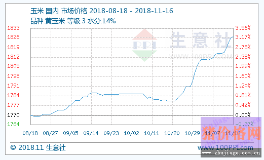 據(jù)生意社監(jiān)測(cè),本周國內(nèi)玉米價(jià)格持續(xù)漲勢(shì),周初3等黃玉米均價(jià)為1816.43元/噸,周末均價(jià)為1827.86元/噸,上漲0.63%。