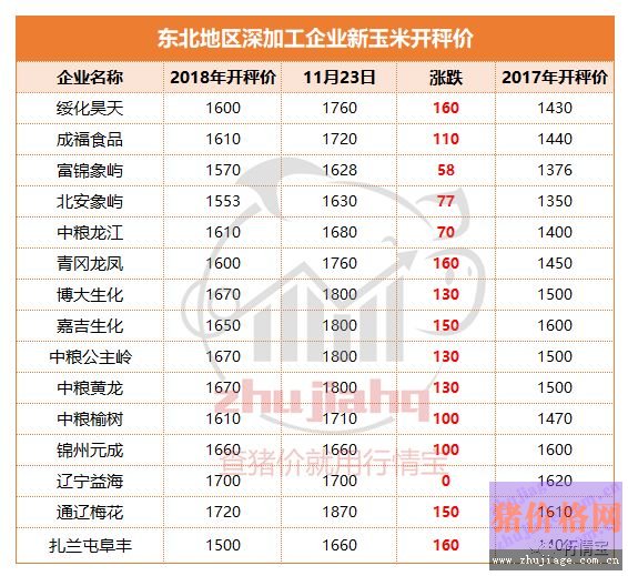 國慶節(jié)前后,東北產(chǎn)區(qū)深加工企業(yè)開始陸續(xù)公布今年新糧開秤價,吉林地區(qū)因前期干旱天氣影響而出現(xiàn)推遲上市情況,導(dǎo)致部分企業(yè)開秤收糧的時間推后15到30天左右。從開秤價來看,東北整體新糧掛牌價同比去年大幅提升80-200元/噸,且高開的同時基本呈現(xiàn)高走趨勢;截至11月23日,黑龍江、吉林多家企業(yè)玉米收購價已經(jīng)突破1700元/噸,遼寧、內(nèi)蒙古局地更是漲至1800-1870元/噸的高位。