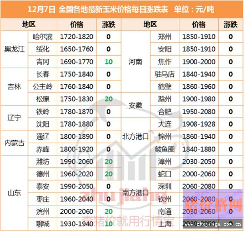 數(shù)據(jù)顯示:12月7日國內(nèi)玉米市場整體企穩(wěn),東北及華北局部產(chǎn)區(qū)玉米收購價小幅下調(diào)10-20元/噸。