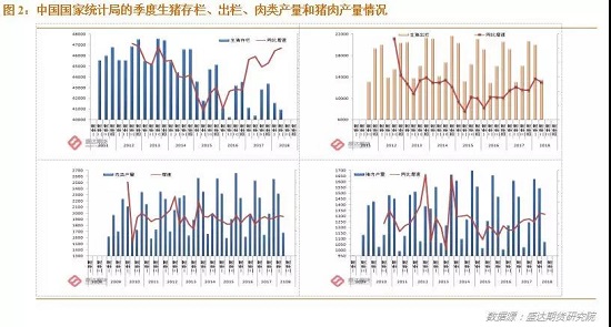 國家統(tǒng)計(jì)局的另一組季度生豬存欄和出欄數(shù)據(jù)的重要性就凸顯了出來。國家統(tǒng)計(jì)局的半年公報(bào)顯示:2018年上半年,豬牛羊禽肉產(chǎn)量3995萬噸,同比增長0.9%;其中,豬肉產(chǎn)量2614萬噸,增長1.4%。生豬存欄40904萬頭,同比下降1.8%;生豬出欄33422萬頭,增長1.2%。而讓研究員苦惱的是,即便該組數(shù)據(jù),公布數(shù)據(jù)與歷史數(shù)據(jù)也有所差異。如,截至2018年6月底,生豬存欄40904萬頭,同比增加1.37%而非下降1.8%。2018年二季度:生豬出欄13439萬頭,同比增加3.11%;肉類產(chǎn)量1679萬噸,同比增加2.19%。