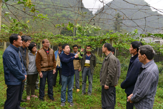 圖為3月27日,該縣燕峒鄉(xiāng)隴沙村第一書(shū)記黃金波在百香果種植基地指導(dǎo)村干部、貧困群眾如何種植百香果。