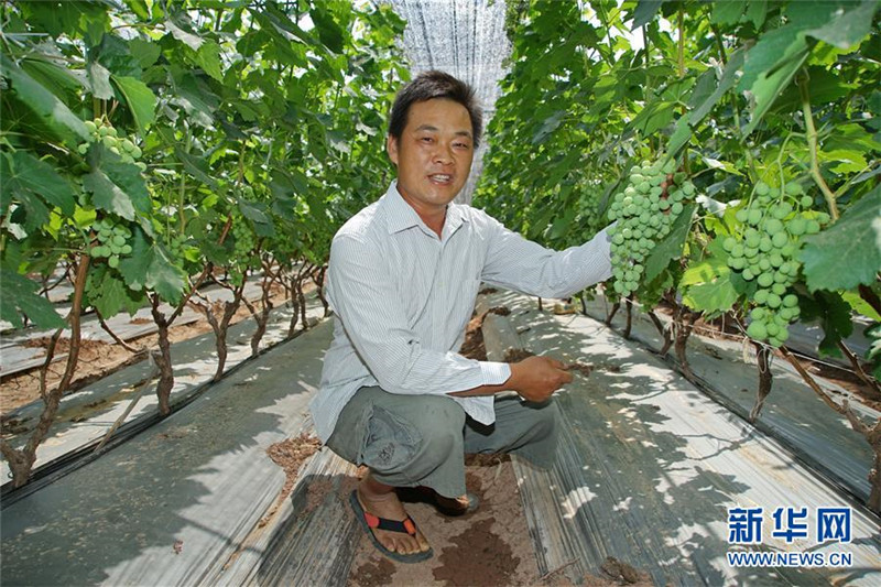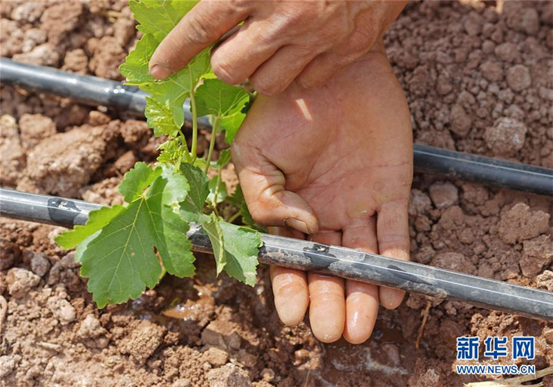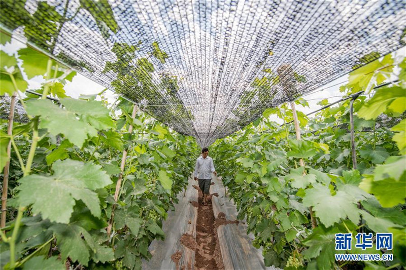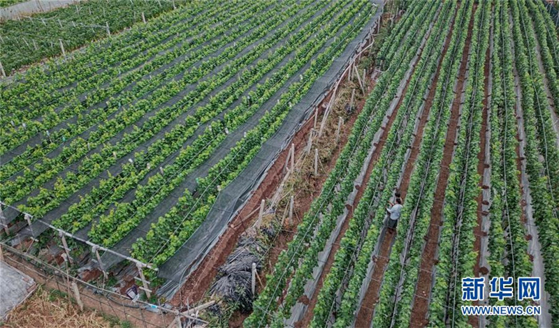 在云南省楚雄彝族自治州元謀縣清和社區(qū),村民余樹(shù)云在自家利用智能水表控制的高效節(jié)水滴灌葡萄園里(4月4日攝)。