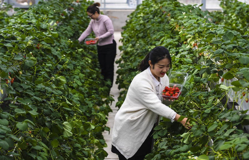 4月5日,游客在河北省棗強縣八里莊村智能大棚里采摘草莓。