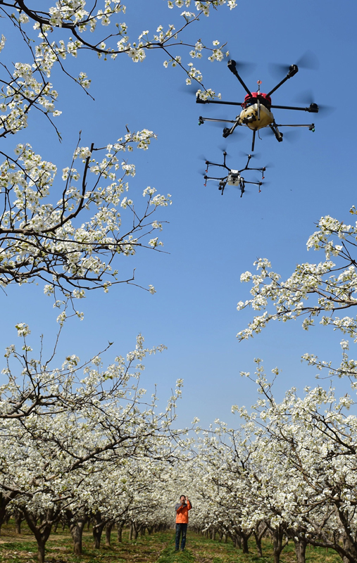 4月9日,在河北省泊頭市付村梨園內(nèi),工作人員操作無人機(jī)為梨花進(jìn)行液體授粉。