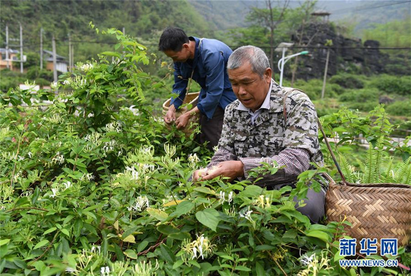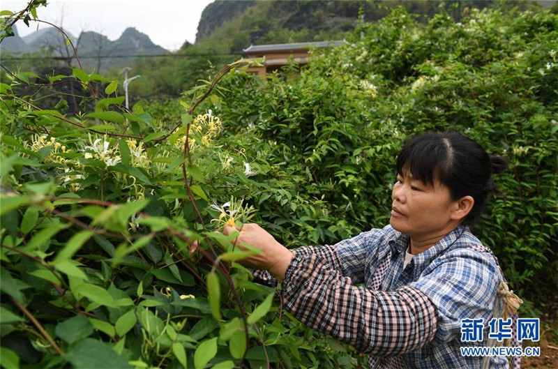 4月11日,在廣西馬山縣古寨瑤族鄉(xiāng)古朗屯,當(dāng)?shù)剞r(nóng)民在采摘金銀花。
