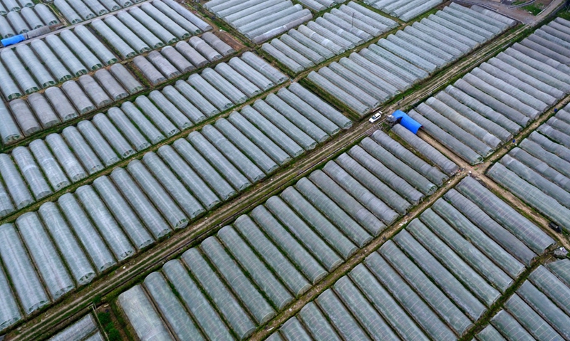 這是4月12日在湖北省宣恩縣李家河鎮(zhèn)金陵寨村拍攝的西瓜大棚(無人機拍攝)。