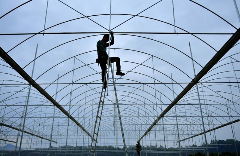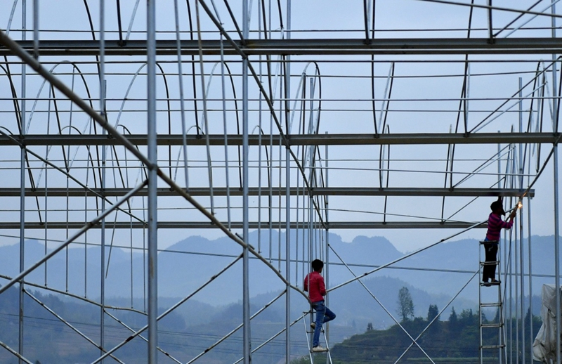 4月12日,在湖北省宣恩縣李家河鎮(zhèn)金陵寨村,村民根據(jù)合作社需要趕建西紅柿大棚。
