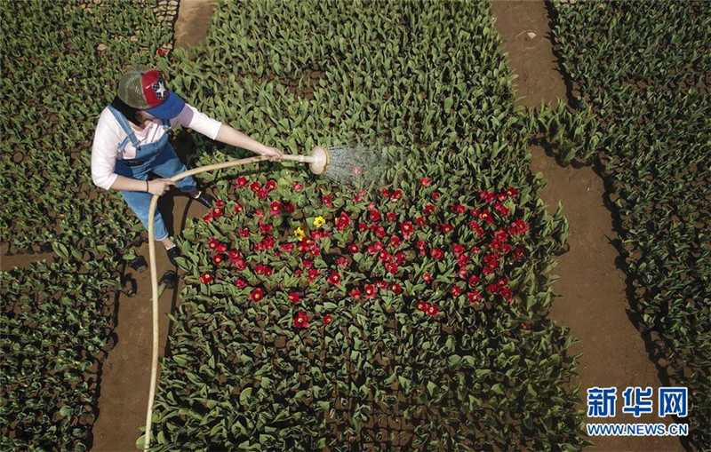 4月12日,在廊坊市廣陽區(qū)盛園花卉基地,花農(nóng)在澆灌郁金香花圃。