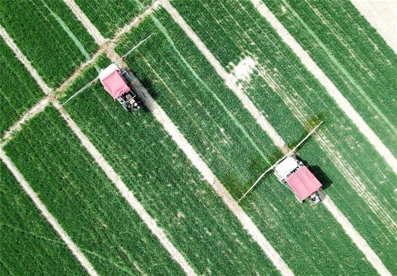 4月12日,河間市景和鎮(zhèn)農(nóng)民在農(nóng)田駕駛農(nóng)用機(jī)械噴灑農(nóng)藥(無人機(jī)拍攝)。