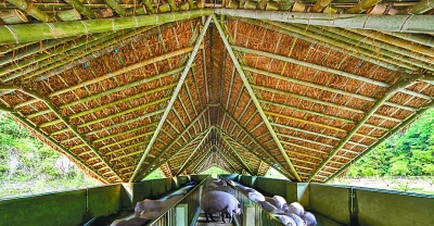 在設(shè)計時,我首先考慮的是材料充沛與否。場地周圍的山坡上竹林茂密,生長著一人多高的茅草,為豬圈提供了主要材料。冬季的毛竹不易蟲蛀且材質(zhì)堅固。經(jīng)竹匠判定,靠冬竹搭建的構(gòu)筑物,在經(jīng)過合適的遮光和防水以后,使用時間可以達到五年。竹子和茅草搭在一起,使用傾斜的屋面,讓雨水沿著茅草的細桿流入用竹筒制作的天然排水管,最終落入農(nóng)田的泥土中。