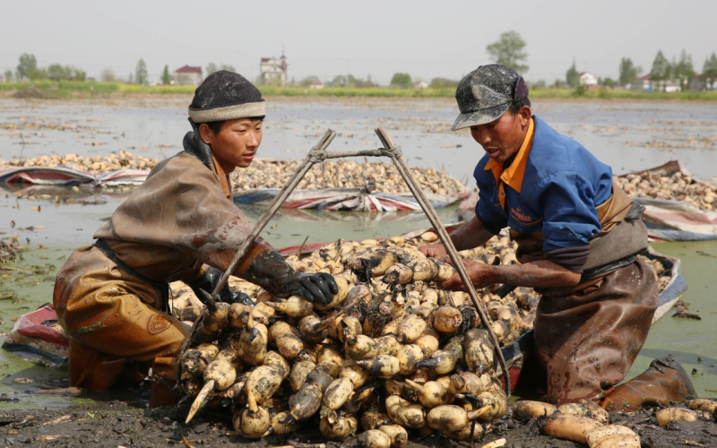 4月15日,在江蘇省海安縣墩頭鎮(zhèn)新舍村,藕農(nóng)采收淺水藕。