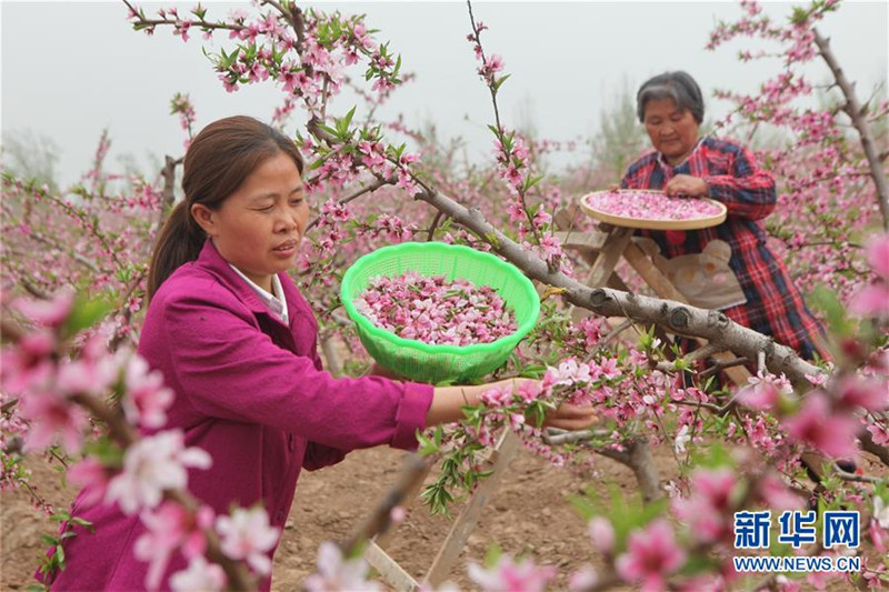 4月16日,河北省魏縣沙口集鄉(xiāng)南沙口村的農(nóng)民在采摘桃花。