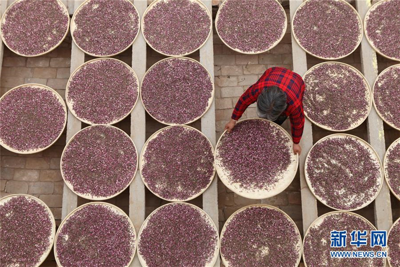 4月16日,河北省魏縣沙口集鄉(xiāng)南沙口村的農(nóng)民在晾曬桃花茶。