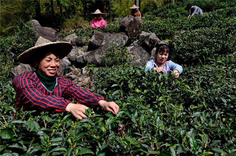 武夷山桐木村村民在采摘春茶(4月15日攝)。
