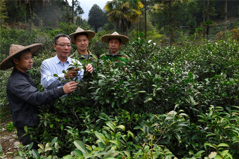 正山小種紅茶傳承人江元?jiǎng)祝ㄗ蠖┫虿柁r(nóng)傳授茶園管理技術(shù)(4月11日攝)。