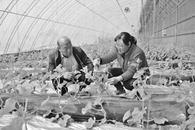 在趙縣齊家村設(shè)施蔬菜大棚里,農(nóng)業(yè)技術(shù)干部郝國(guó)法正在現(xiàn)場(chǎng)講解瓜菜種植技術(shù)。