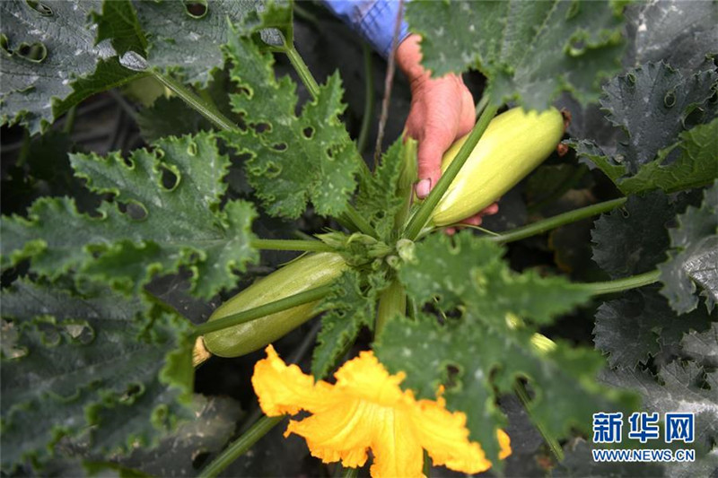 4月18日,一位村民在甘肅省酒泉市肅州區(qū)總寨戈壁農(nóng)業(yè)產(chǎn)業(yè)園的日光溫室內(nèi)采摘蔬菜。