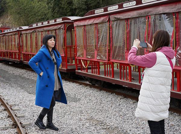 ▲ 小火車成了魯家村美麗富足的新名片,越來越多的游客紛至沓來。圖中,兩位游客興致勃勃與小火車合影留念。
