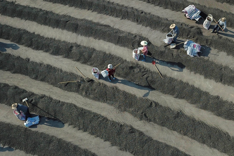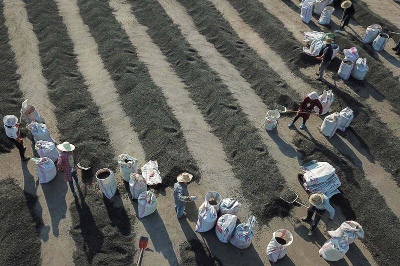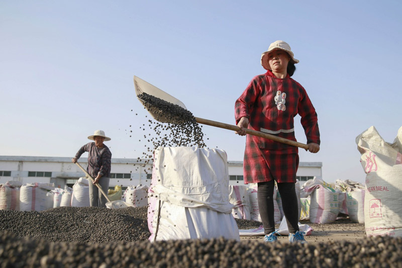 4月21日,在江蘇省淮安市盱眙縣維橋鄉(xiāng)芡實(shí)合作社,農(nóng)民將晾曬的芡實(shí)裝袋。