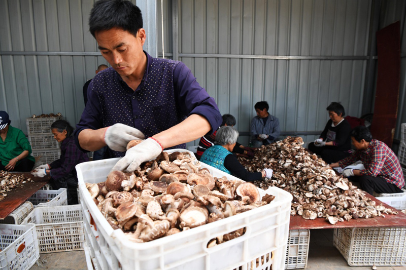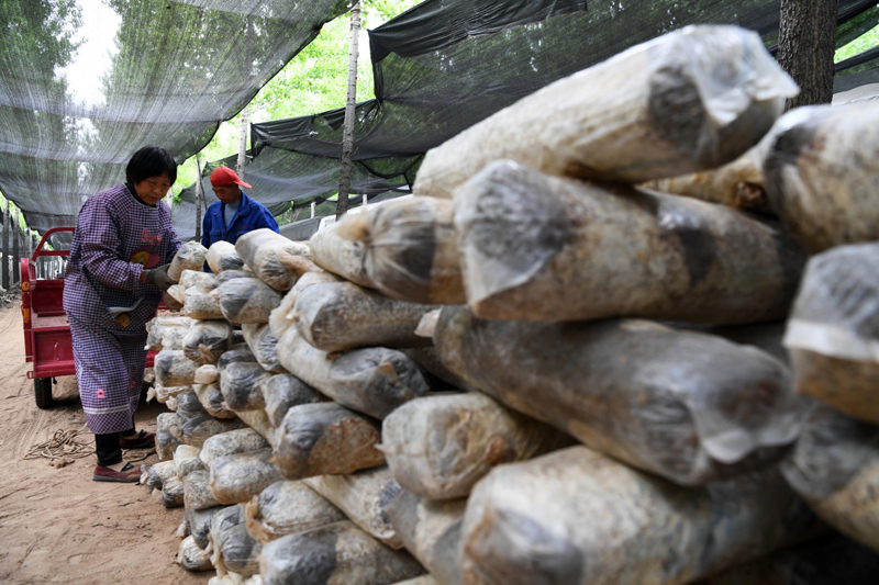 4月21日,民權(quán)縣程莊鎮(zhèn)江集村村民在林下蘑菇產(chǎn)業(yè)園扶貧基地勞作。