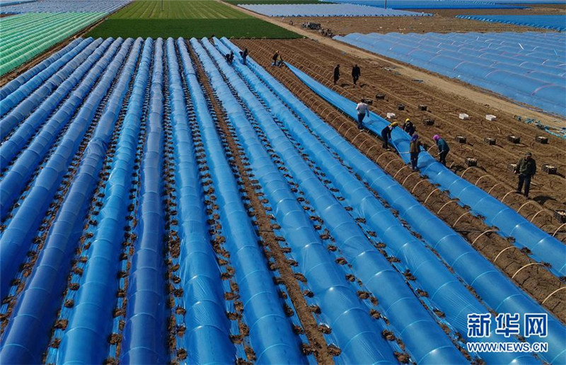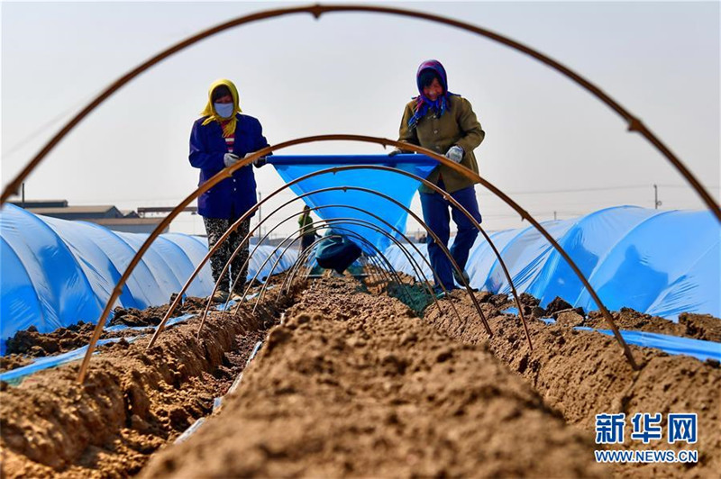 4月20日,唐山市豐潤(rùn)區(qū)新軍屯鎮(zhèn)新軍屯村農(nóng)民在給剛播種的生姜覆膜。