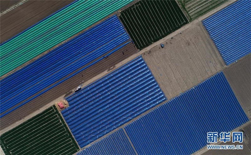 4月20日,唐山市豐潤(rùn)區(qū)新軍屯鎮(zhèn)新軍屯村農(nóng)民在給剛播種的生姜覆膜(無(wú)人機(jī)拍攝)。