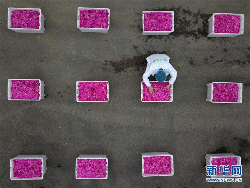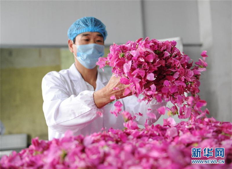 4月21日,在貴州省鎮(zhèn)遠(yuǎn)縣青溪鎮(zhèn)一家花酒公司,工人在加工玫瑰花。
