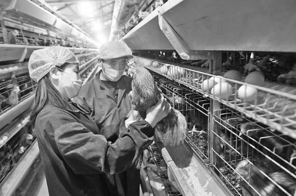 4月14日,姚婷(左)和合作社工作人員察看蛋雞生長情況。