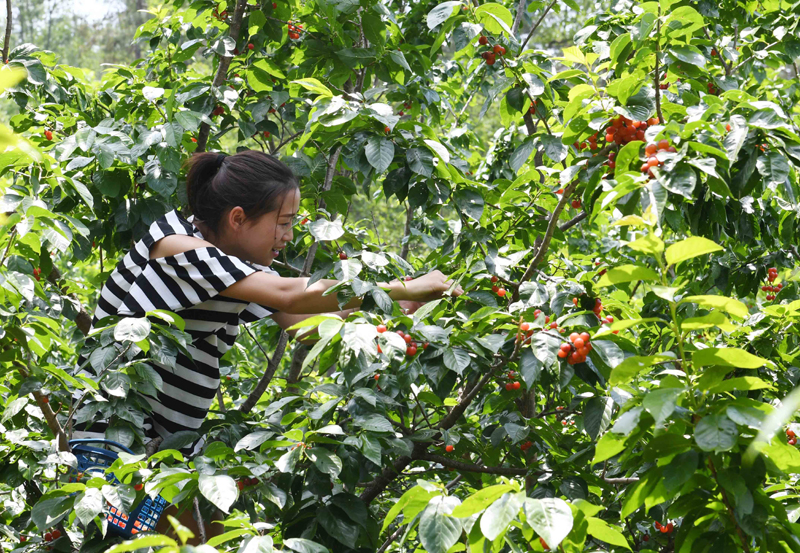 4月25日,富民縣赤鷲鎮(zhèn)平地村的農(nóng)民在自家種植的果園采摘櫻桃。