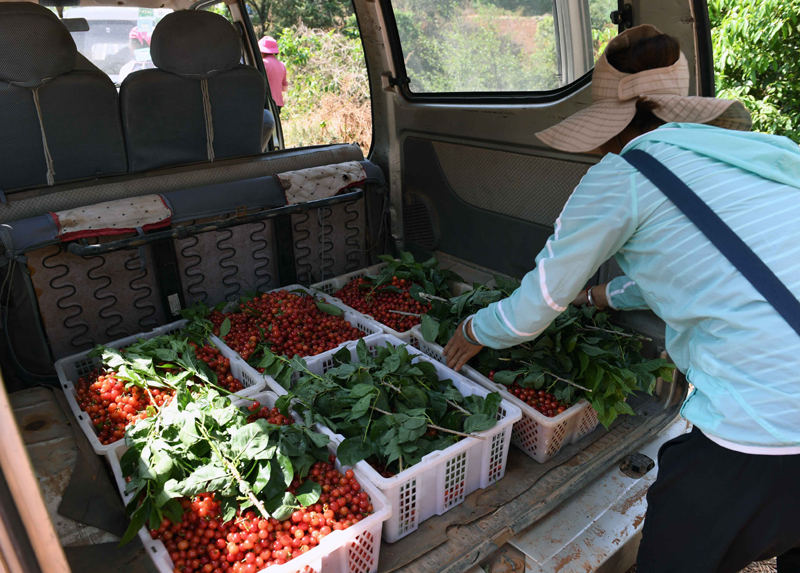 4月25日,富民縣赤鷲鎮(zhèn)平地村的農(nóng)民在裝運剛采摘的櫻桃。