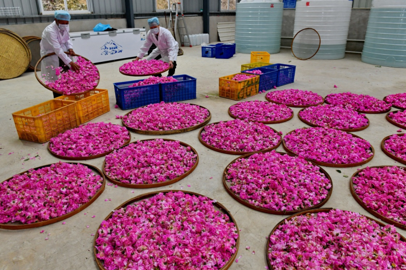 4月25日,福建蕃秀玫瑰園科技有限公司工人在丹云鄉(xiāng)裝運玫瑰花瓣,準備用于加工提煉玫瑰精油。
