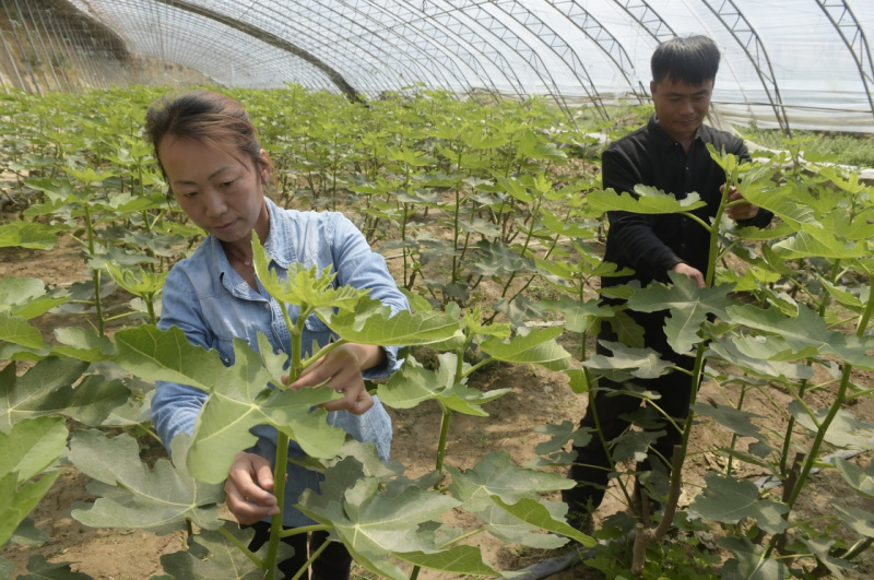 4月27日,位于固安縣牛駝鎮(zhèn)門鐵營村的盛世農(nóng)合綠色果蔬生產(chǎn)基地的工作人員在大棚內(nèi)對無花果進行田間管理。