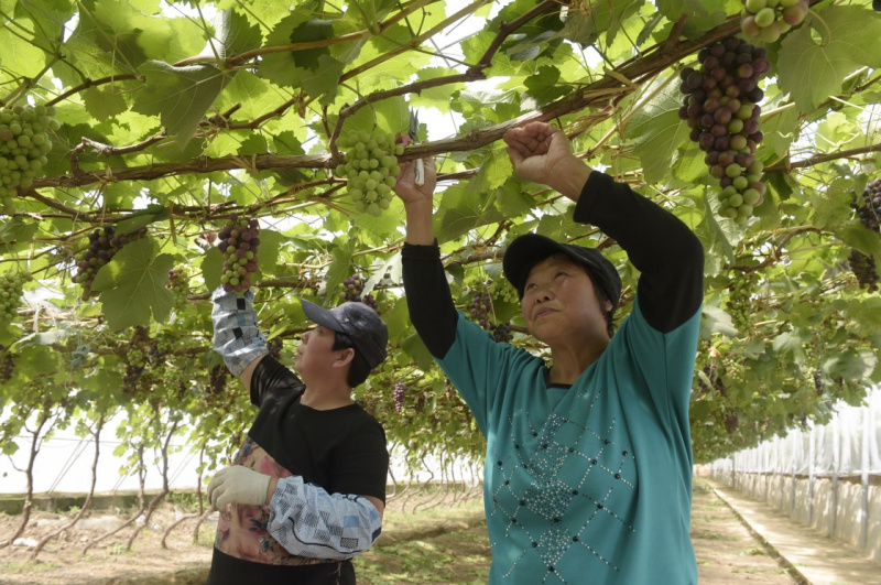 4月27日,位于固安縣牛駝鎮(zhèn)門鐵營村的盛世農(nóng)合綠色果蔬生產(chǎn)基地的工作人員在大棚內(nèi)對葡萄進行田間管理。