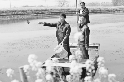 圖為泗洪縣龍集鎮(zhèn)蟹農(nóng)在塘口里投喂餌料。臧倩攝
