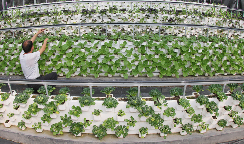 4月28日,在山東省日照市一處農(nóng)業(yè)科技示范園,一名農(nóng)民為立體栽培區(qū)的作物整理養(yǎng)料管。