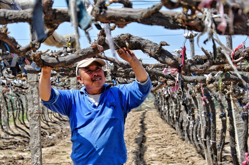后黑龍廟村的農(nóng)民在捆綁葡萄枝干(4月28日攝)。