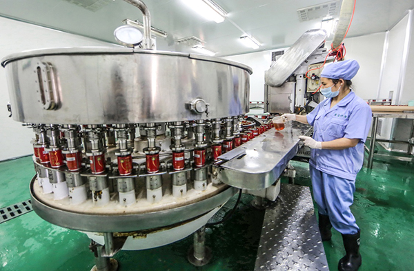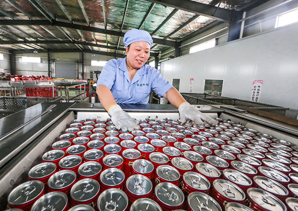 5月2日,江西廣昌一家食品公司的工人在罐裝荷葉茶生產(chǎn)線上忙碌。