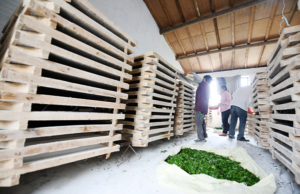 5月2日,在江蘇海安一家蠶業(yè)農場,蠶農為春蠶飼喂新鮮桑葉。
