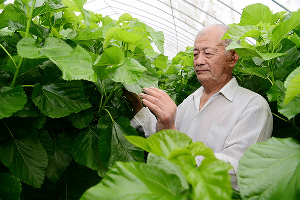 5月2日,在江蘇海安一家蠶業(yè)農場,蠶農察看大棚里桑樹的長勢。