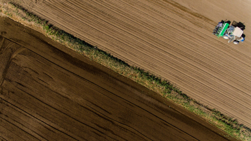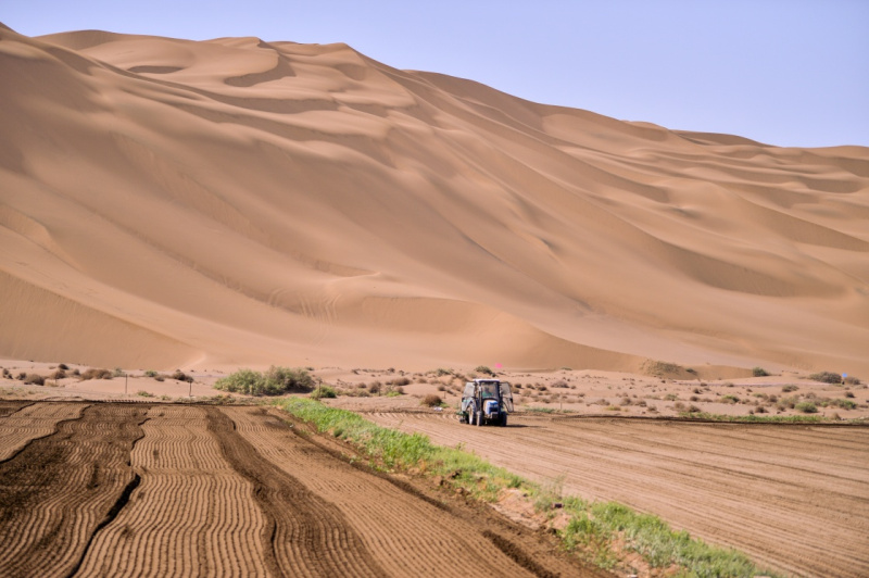 5月5日,播種機(jī)在庫(kù)木塔格沙漠邊的稻田播種。