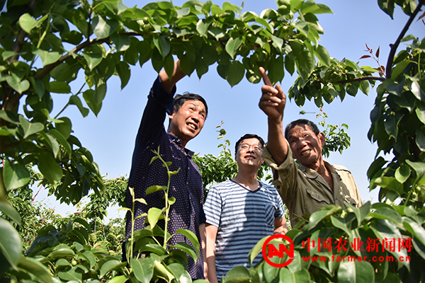 圖為5月4日,在社旗縣朱集鎮(zhèn)袁老莊村,合作社發(fā)起人劉相奎(右一)正在指導(dǎo)社員為黃金梨蔬果。