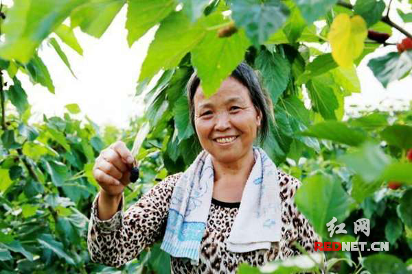 貧困戶在桑樹叢中開心地笑了。