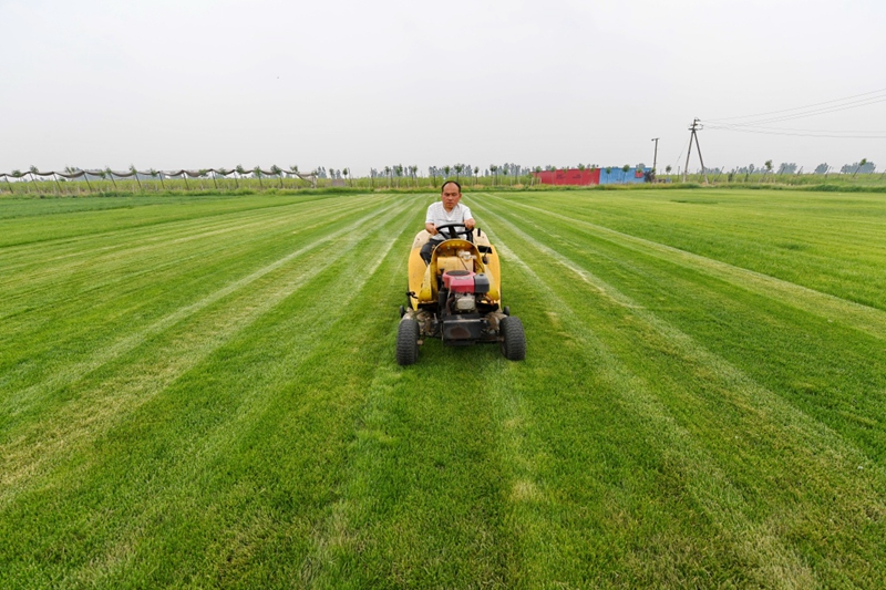 2015年,劉捷成立了滄縣鴻楊草坪種植專業(yè)合作社,吸納村民就業(yè),走上規(guī);N植的道路。如今,合作社草坪種植規(guī)模達(dá)300余畝,成員80余人,年銷售收入近200萬元。在劉捷的影響下,小馬莊村很多村民都加入到種植草坪的隊(duì)伍中來,全村草坪種植面積超過1000畝,成為遠(yuǎn)近聞名的“草坪專業(yè)村”。新華社記者 牟宇 攝