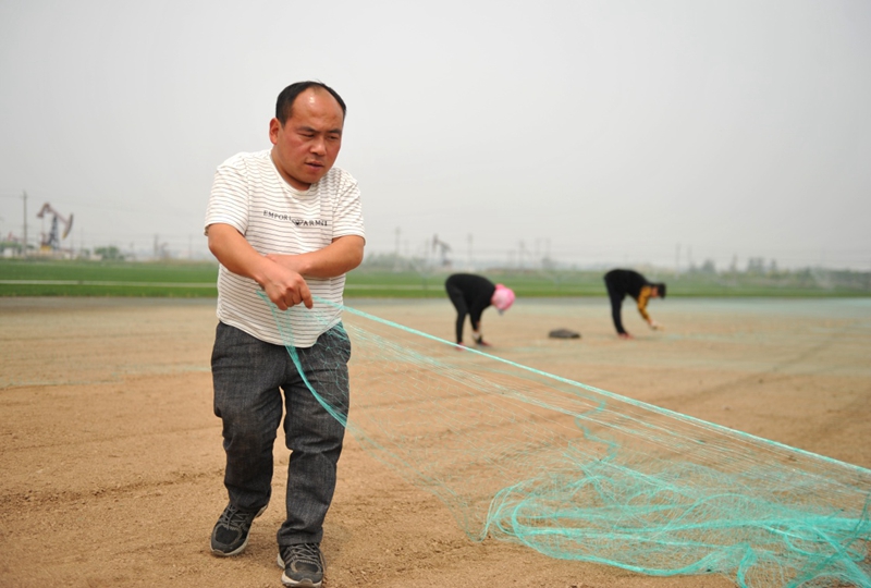 5月12日,劉捷在滄縣鴻楊草坪種植專業(yè)合作社鋪設(shè)種植草坪所需的地網(wǎng)。